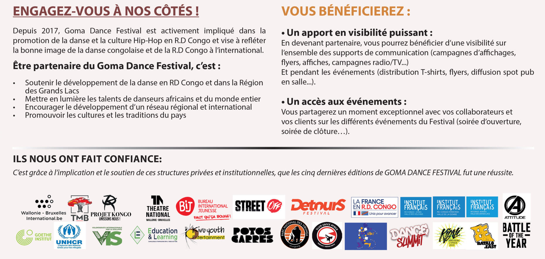 Ces collaborations nous permettent d’organiser des qualifications régionales et nationales et des sélectionner les danseurs qui seront invités à Goma lors du Goma Dance Festival, ainsi que de favoriser la coopération régionale.